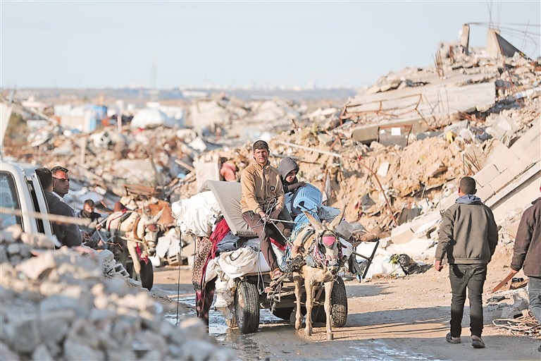 3月22日,从加沙地带北部拜特拉希耶撤离的巴勒斯坦民众经过加沙城。 新华社发