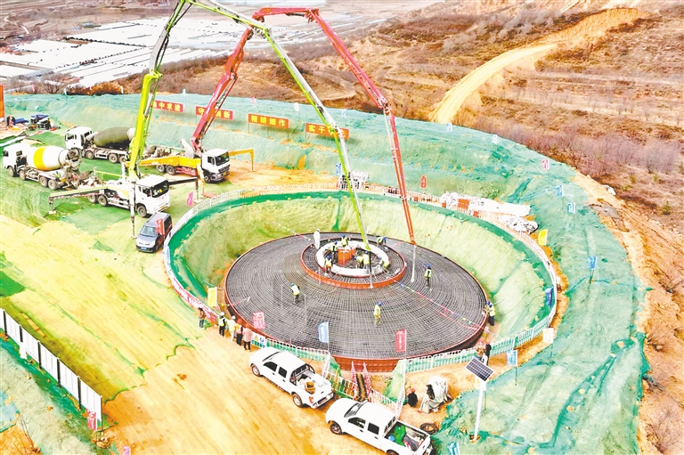 本报讯 (记者 鲁延宏)3月26日,“宁湘直流”配套固原100万千瓦风电基地项目现场,首台风机基座正在进行混凝土浇筑。