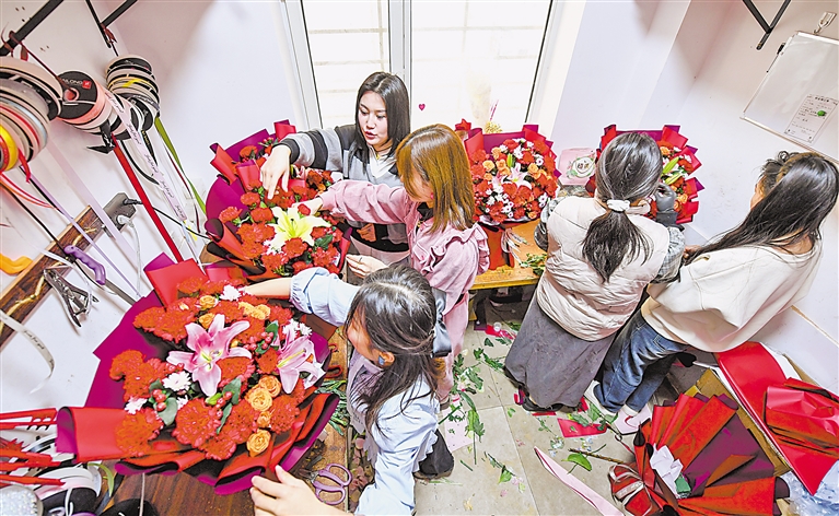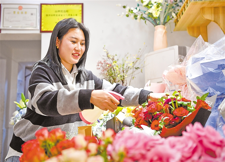 醒花、打刺、养花……“95后”店主宋丽萍娴熟地打理着刚从昆明运来的鲜切花。“包得还不错啊,你年纪这么小就当花艺师啦。”一名顾客取到花束后发出赞叹。