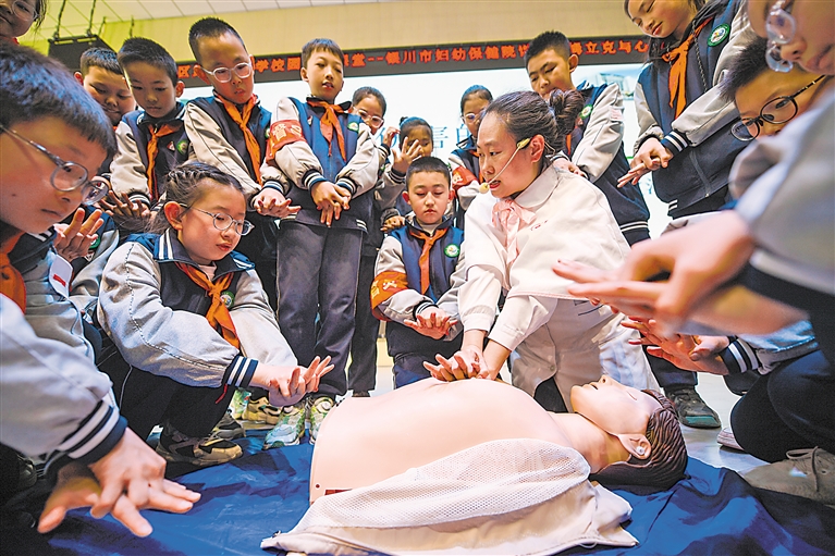 为增强青少年急救意识,提升校园应急救护能力,3月25日,银川市金凤区第二十小学邀请银川市妇幼保健院医护人员走进校园,为孩子们讲解“健康急救”专题课程。 本报记者 马楠 王洋 实习生 孙莎莎 摄