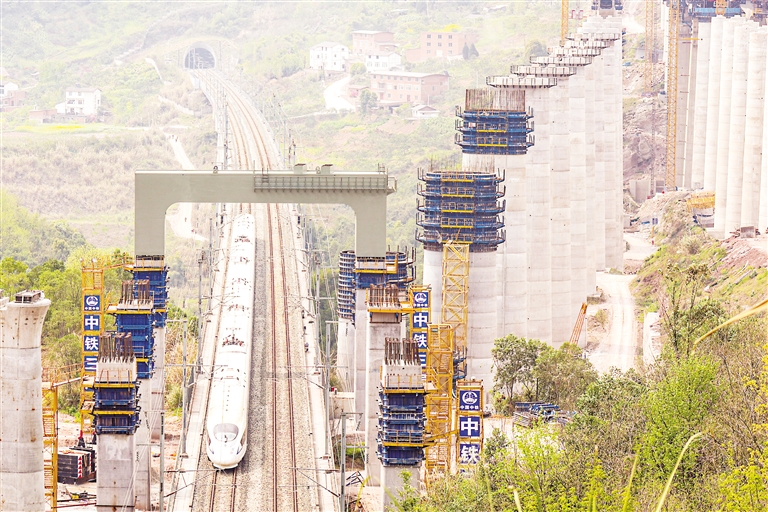 3月27日,郑渝高铁线上一列动车从门式墩钢横梁下通过。3月27日凌晨,在中铁三局承建的成达万高铁左线福寿跨渝万城际特大桥项目施工现场,一榀重达165.8吨的门式墩钢横梁稳稳落在支座上,标志着成达万高铁首个跨既有高铁钢横梁吊装完成,也是三峡库区首次跨既有铁路线施工作业的成功案例,为后续桥梁架设奠定关键基础。 新华社发
