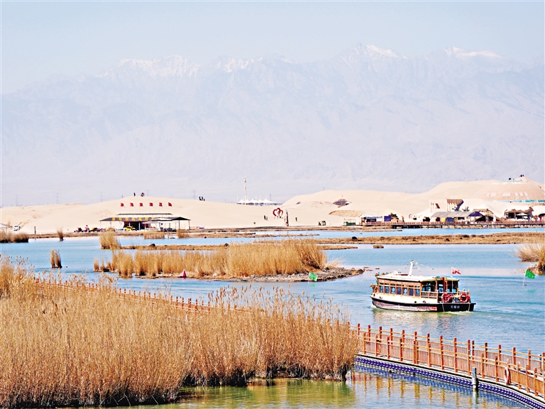 3月29日,游客在沙湖景区乘船游玩。当日,宁夏沙湖景区举行“出湖入海 逐浪四季”旅游主题系列活动,数千名游客齐聚沙湖,共同体验低空经济、沙雕制作、垂钓竞技等文旅活动。 新华社记者 王鹏 摄