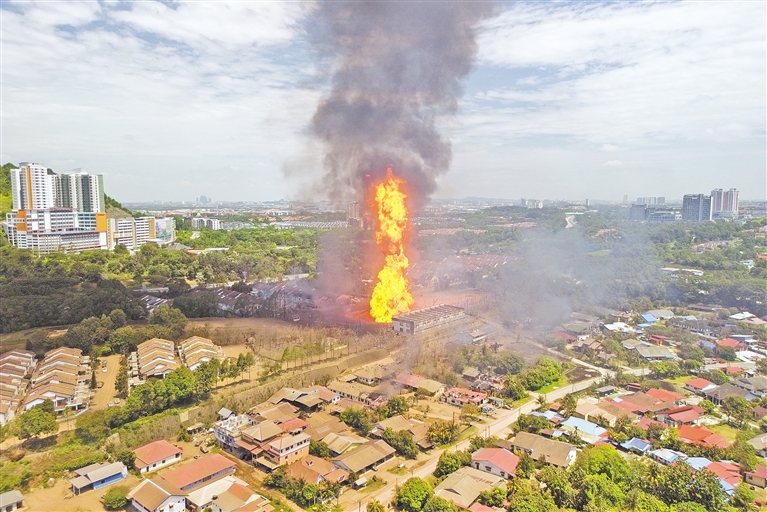 这是4月1日在马来西亚雪兰莪州拍摄的火灾现场(无人机照片)。据当地媒体4月1日报道,马来西亚雪兰莪州蒲种市市区当天上午发生燃气管道爆炸事故并引发大火,火焰高数百米。大火导致112人受伤,事故原因仍待进一步调查。 新华社发