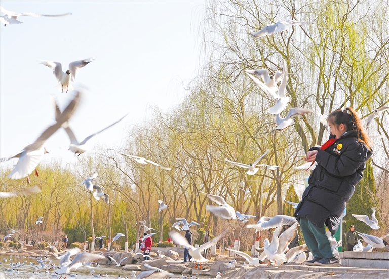 4月2日,以“清除鸟网,密织法网,让鸟儿自由飞翔”为主题的自治区第43届爱鸟周宣传活动启动。每年4月第一周被确定为宁夏爱鸟周。图为一名学生在银川海宝公园与鸟互动。 本报记者 付杨 马雨馨 摄