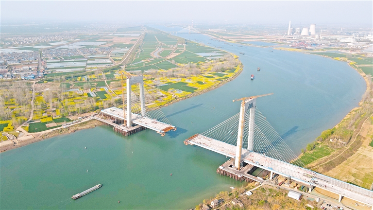 4月2日拍摄的G329临淮关跨淮河特大桥建设现场。目前,位于安徽省蚌埠市、滁州市的3座跨淮河特大桥建设稳步推进,中铁四局施工人员抢抓春季有利天气,奋战在建设一线,高标准高质量推进大桥建设。新华社发