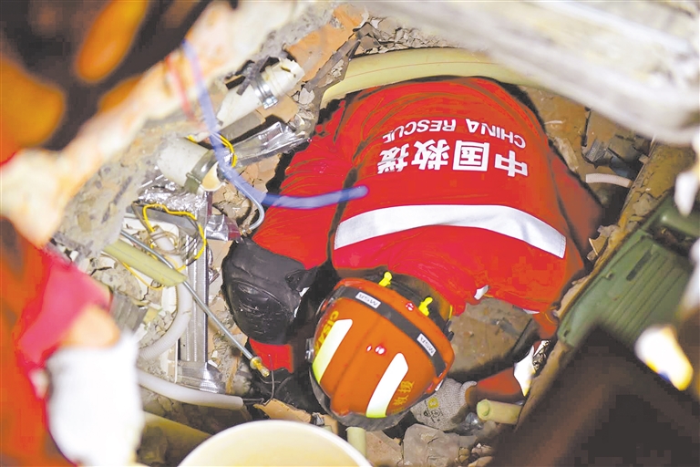 4月1日,中国国际救援队队员在缅甸曼德勒一处酒店开展救援。由中国军队参与组派的中国国际救援队4月1日在缅甸曼德勒城区多点位持续开展救援。 新华社发(中国国际救援队供图)