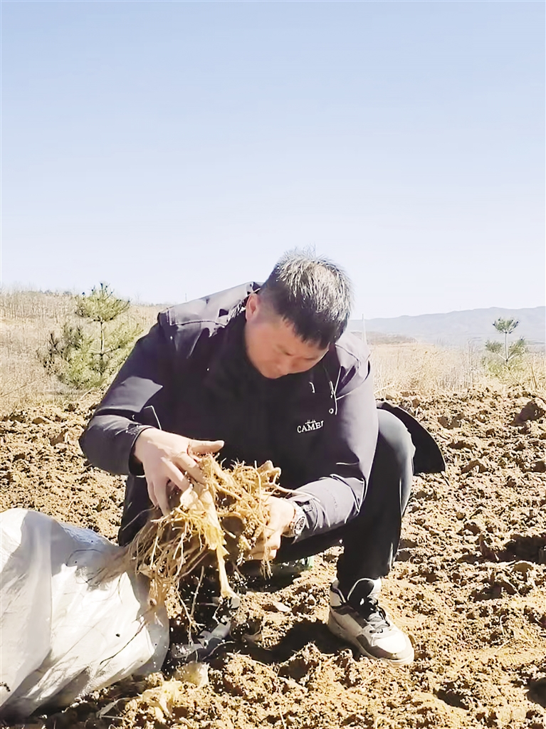 3月24日,十几台拖拉机在田埂上轰鸣,于永杰手上沾满了机油和泥巴。跨在拖拉机上,他帮着农户翻犁土地。下了拖拉机,他又帮着农户翻出埋在土里的中药独活,再用手机拍下照片,发给外地的老板。外地老板看后,直夸“泾源的中药材好”。