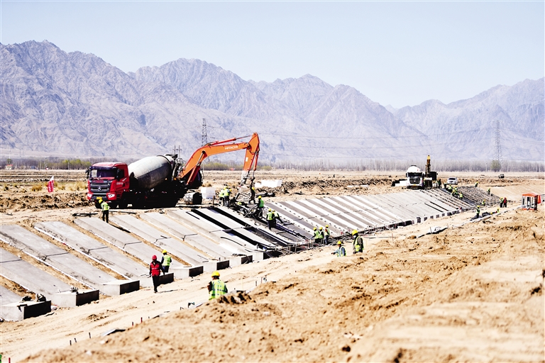 4月4日,青铜峡灌区现代化改造项目第二农场渠砌护工程现场,工人在渠道护坡上进行混凝土浇筑。据悉,4月下旬工程完工后,将显著提高水资源利用效率,保障粮食主产区灌溉用水。 本报记者 王鼎 摄
