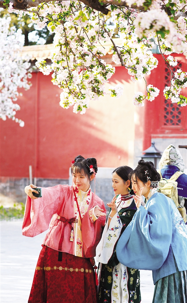 4月5日,游客在北京故宫文华殿前自拍留念。 均新华社发