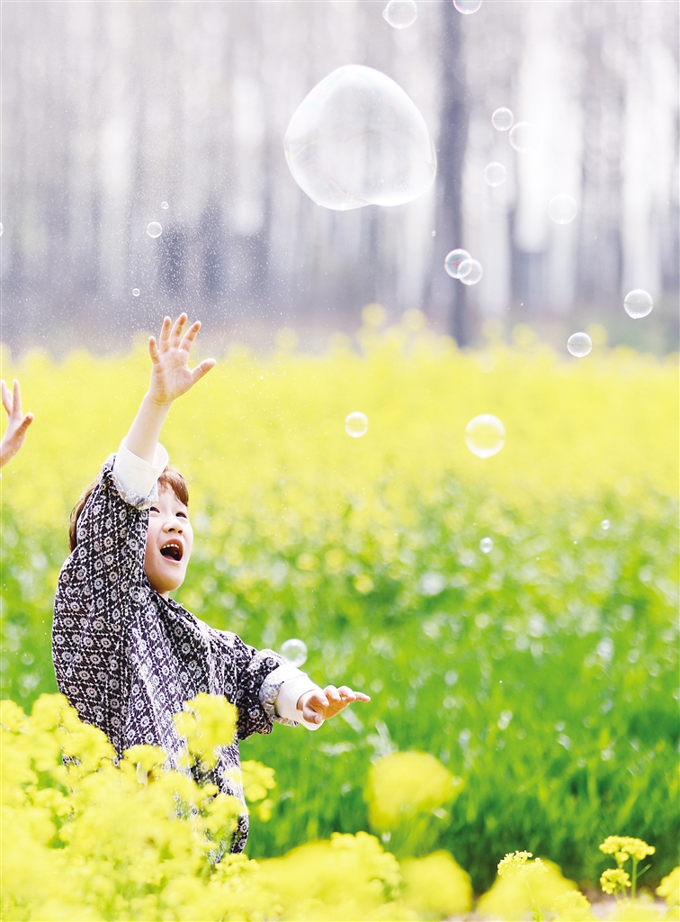 4月5日,小朋友在山东省临沂市郯城县郯城街道一处油菜花田游玩。
