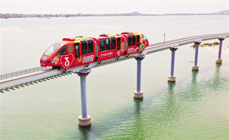 4月5日,游客在海南海洋欢乐世界度假区乘坐海上小火车(无人机照片)。清明时节,人们外出游玩,放松身心。