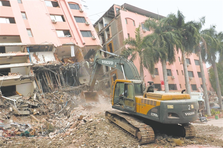 4月5日,工程机械清理缅甸曼德勒一处受损建筑的瓦砾。据缅甸广播电视台4日报道,缅甸强震目前已造成3301人死亡,4792人受伤,另有被报失踪人员200多人。