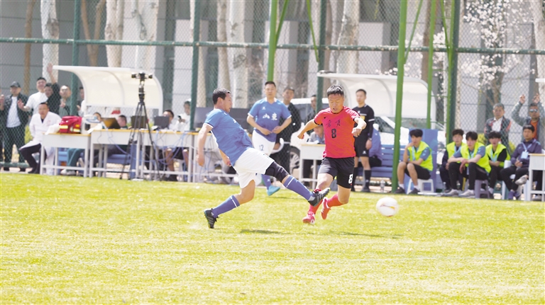 4月6日,第十五届全运会群众比赛足球项目七人制男子老将组预赛在银川开幕。图为宁夏队队员在比赛中突破过人。最终,宁夏队以2:1战胜山东队,取得首场胜利。