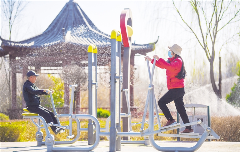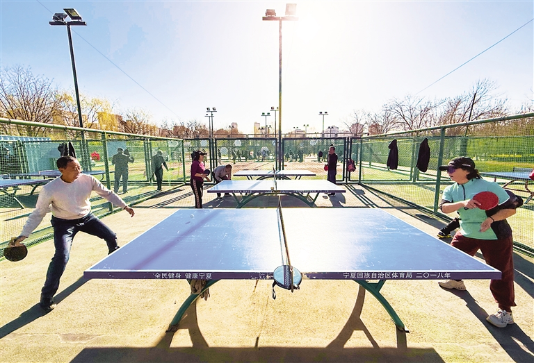 4月5日,市民在银川毓秀公园打乒乓球。当日,该公园迎来许多晨练市民,运动的人们成为假日清晨的亮丽风景。本报记者 马楠 摄