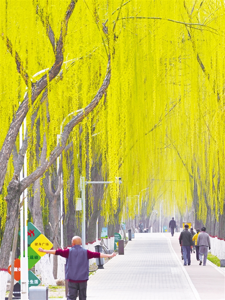 4月5日,银川唐徕渠畔垂柳依依,市民漫步其间,享受大好春光。 本报记者 左鸣远 摄