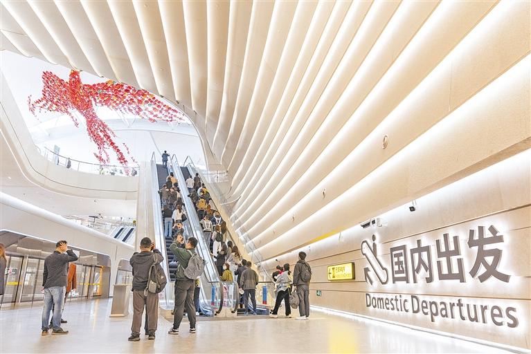 4月9日,旅客和媒体搭乘扶梯前往重庆江北国际机场T3B航站楼登机口。