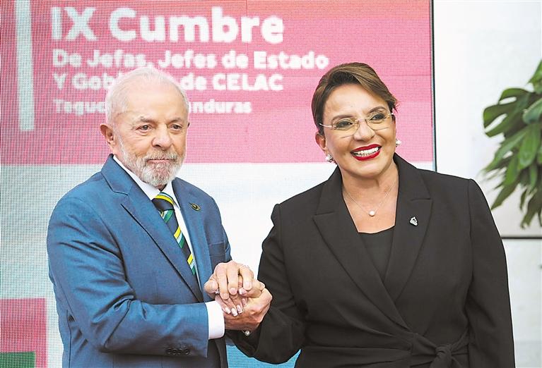 4月9日,在洪都拉斯首都特古西加尔巴,巴西总统卢拉(左)在拉美和加勒比国家共同体第九届峰会会场与洪都拉斯总统卡斯特罗握手。拉美和加勒比国家共同体第九届峰会9日在洪都拉斯首都特古西加尔巴举行。会议呼吁拉共体各国积极推动地区一体化,以应对美国滥征关税和移民政策所带来的挑战。 新华社发