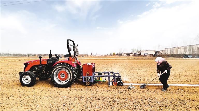 4月10日,青铜峡市小坝镇永丰村制种玉米基地,宁夏福裕农业科技有限公司配备北斗导航智能终端的无人驾驶拖拉机拖着制种玉米播种机,自动穿梭于田间精量播种、覆膜,每天播种面积达150亩。 宁夏日报报业集团全媒体见习记者 李霞霞 摄