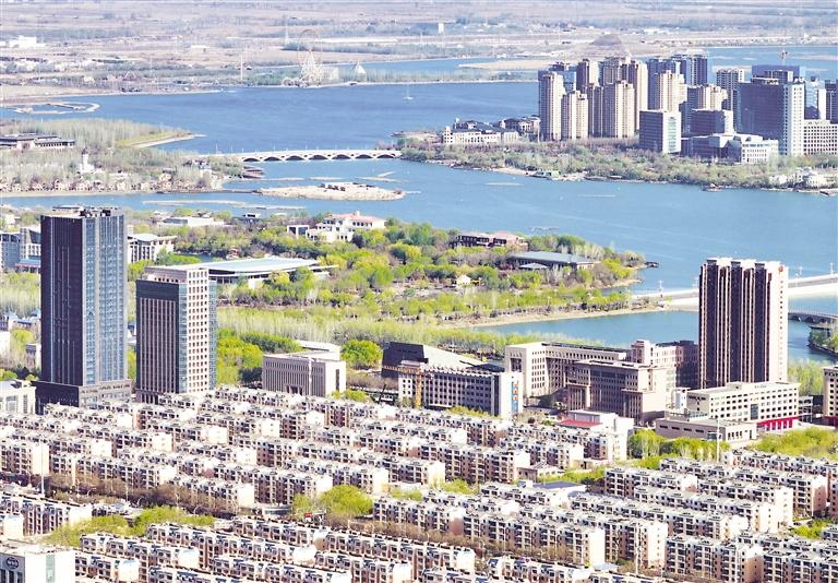 4月12日,“银川蓝”再现。当日,银川市空气质量改善明显,林立的城市建筑与清澈的湖泊湿地相映成景。 本报记者 马楠 摄