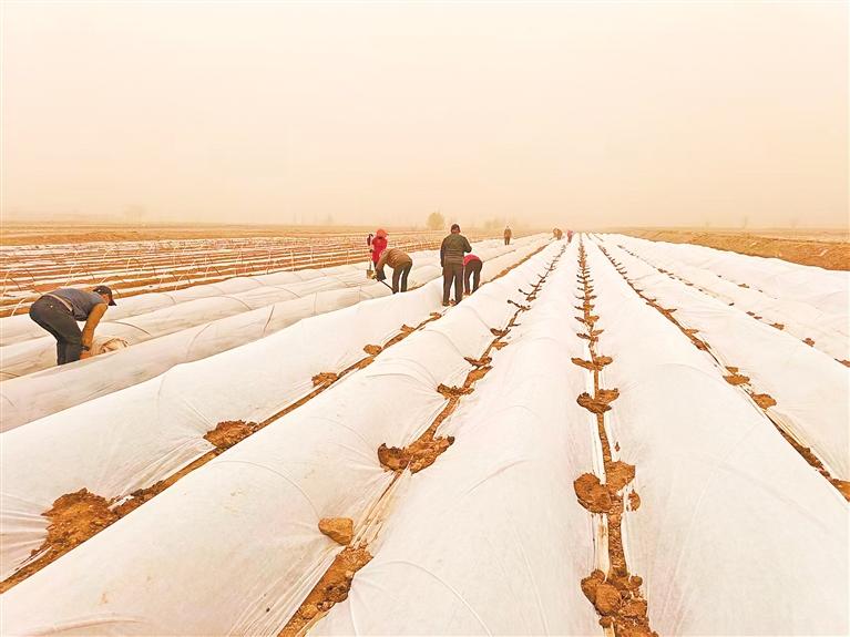 4月11日,青铜峡市邵岗镇邵北村村干部和村民一起固定农田地膜。青铜峡市各部门积极应对寒潮大风沙尘霜冻天气,确保群众生命财产安全和生产生活秩序稳定。