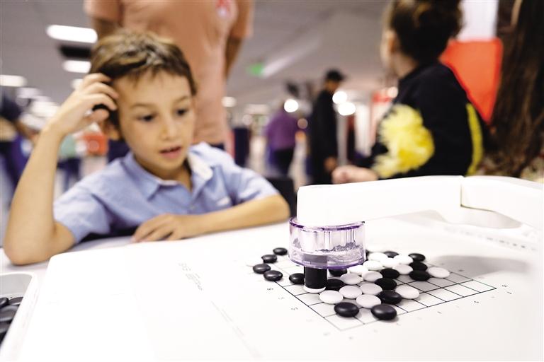 4月12日,一名学生在利用机器人学习围棋。 新华社发