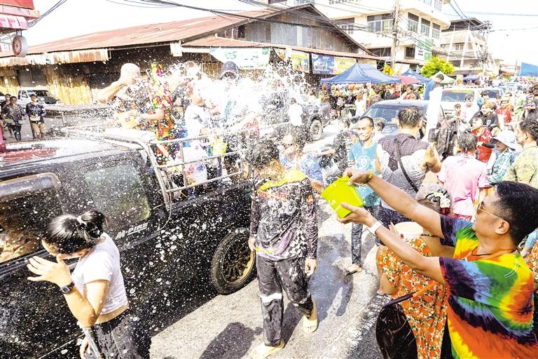 4月13日,人们在泰国巴真府参加泼水节庆祝活动。泼水节又称宋干节,是泰国、老挝、缅甸、柬埔寨等国的新年。 新华社/美联
