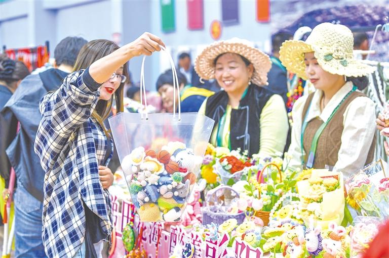 在第二十一届宁夏六盘山山花节暨“梯田花海·醉美彭阳”农文旅促消费活动现场,彭阳县及周边县区精心布置了农特产品、非遗文创产品、康养产品、家电促消费等展示展销区,为游客提供丰富的购物选择。