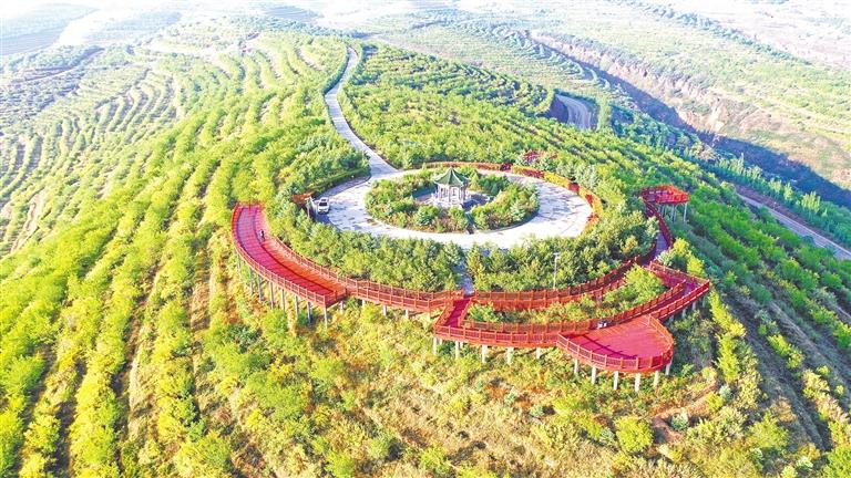 但造林队员们仍日复一日地奋战在荒山上。手磨破了,缠上胶布戴着手套继续挖;锹挖断了,换一把接着干。凭借这种不服输的韧劲,造林队将阳洼流域、长城塬的荒地,建设成重点经济林带建设示范点。这片示范点,就是当下游客争相打卡的金鸡坪梯田公园。