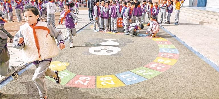 石嘴山市第六小学德育副校长徐凤嫒介绍,去年8月,在教育主管部门的支持下,学校按建设标准配备体育场地,确保生均体育活动面积符合要求,并利用校园“边角料”打造“微场地”等方式,盘活活动场地,学校围绕U型跑道设计了大量的地面喷绘游戏。这些地面喷绘图案丰富,形式多样,学生可以进行跳跃、奔跑、追逐等运动,“这些改造使运动过程变得更加有趣和富有挑战性,增加了运动乐趣,让学生更愿意主动参与户外活动,最大限度提高场地利用率,有效控制了近视率、肥胖率。”她说。