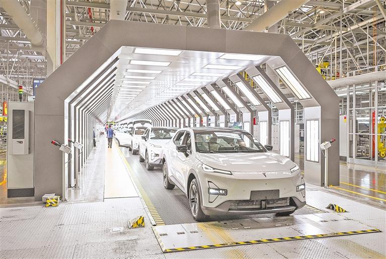 2025年1月9日在位于重庆市渝北区的长安汽车数智工厂总装车间拍摄的即将下线的新能源汽车。 新华社发