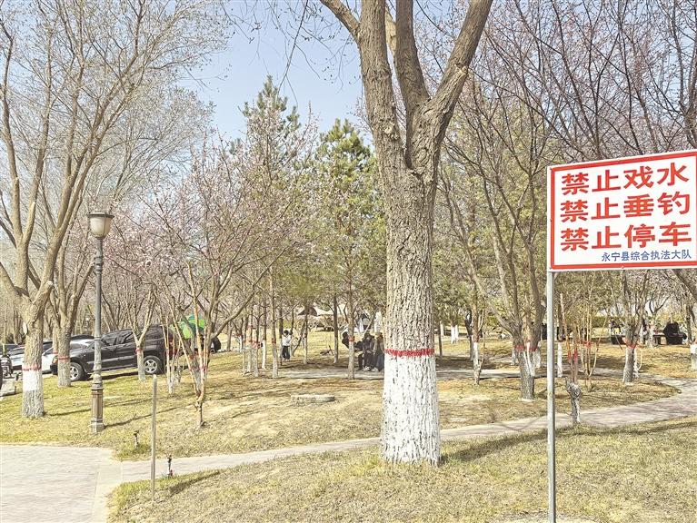 银川市永宁县三沙源附近的一处草坪上,右侧显眼处立着一块由永宁县综合执法大队设立的警示牌,明确写着“禁止戏水 禁止垂钓 禁止停车”。然而,附近却停放着多辆汽车。不仅破坏了公园的美观,也凸显出部分市民对公园管理规定的漠视。(本报记者 智慧 摄)