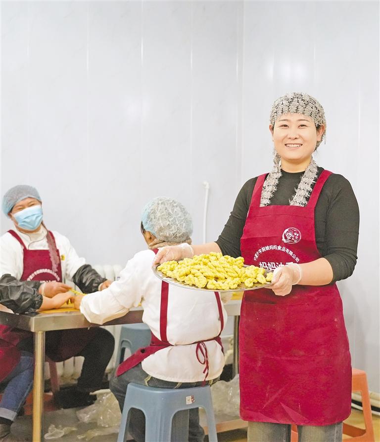 于是,骑上电动车,苏小芳来到了乡上的宁夏什字厨娘妈妈食品有限公司。干净明亮的生产车间、库房和展销室里,大家各司其职,已然开始工作。生产车间的一头,几个厨娘围坐在一起专注地搓麻花,小小的面剂子在她们灵巧的双手中瞬间变成细长的面条,再轻轻一拧,便成了漂亮的麻花。另一头,苏小芳将面粉、白砂糖、鸡蛋和胡麻油按比例配好,投入和面机。几番搅动下,面团已散发出阵阵清香。