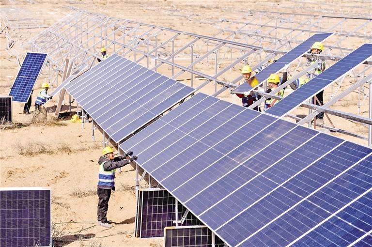4月18日,中铁十六局集团宁国运盐池高沙窝92万千瓦光伏项目建设现场,工人在打钢桩、安支架、装组件。据了解,该项目占地2.78万亩,目前以每日完成螺旋钢桩施工15000根、灌注桩施工3500根、支架施工1300套的速度推进,计划6月底完成建设、具备并网条件,预计每年为电网输送超17亿千瓦时清洁电能。 本报记者 王晓龙 摄