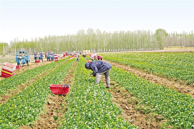 4月19日,在永宁县李俊镇供外蔬菜基地,专业采收工忙着收割菜心。近年来,永宁县供外蔬菜面积稳定在5万余亩,供外蔬菜产业成为当地农民收入的重要来源。 宁夏日报报业集团全媒体记者 张艳丽 摄