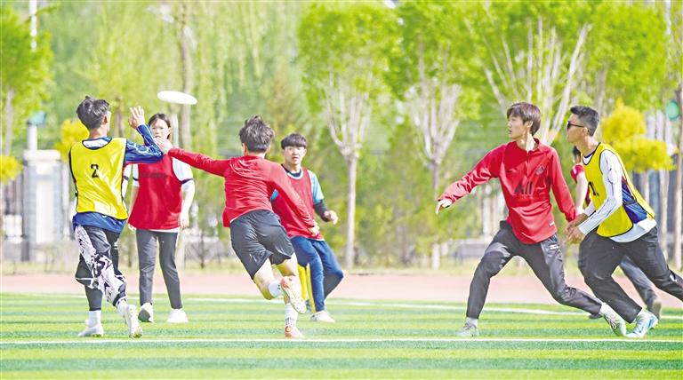 ① 4月20日,在银川市第三十六中学操场上,运动员激烈拼抢。当日,由宁夏学生体育艺术联合会主办、金凤区教育局承办的全区校园飞盘联赛(四月赛)在此举办。