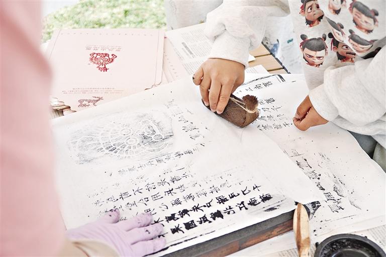 4月19日,非遗代表性传承人指导市民学习拓印制作。当日,2025年“春笺书韵·非遗拾光”银川市图书馆“4·23”世界读书日暨公共图书馆服务宣传周系列文化活动在银川森林公园拉开帷幕。 (图片由受访单位提供)