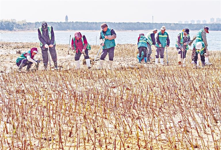 4月21日,在山东省荣成市桑沟湾海域,园林工人在进行芦苇种植作业(无人机照片)。第56个世界地球日到来之际,各地开展形式多样的主题活动,倡导人们保护环境,珍爱地球。新华社发