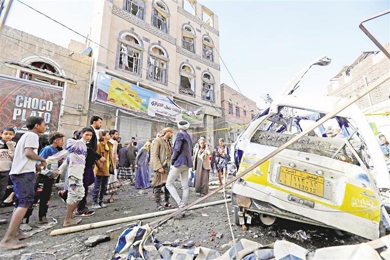 4月21日,在也门首都萨那,人们查看空袭现场。也门胡塞武装卫生部门20日晚表示,美军当晚对也门首都萨那市中心一个市场进行空袭,造成至少12人死亡、30多人受伤。 新华社发