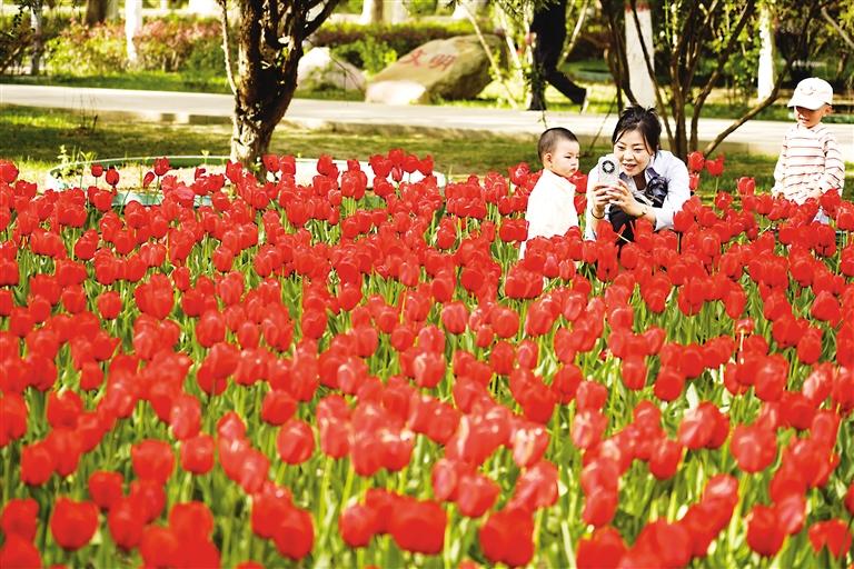 4月22日,游客在银川中山公园郁金香花海中拍照。近日,数十个品种的郁金香在银川中山公园迎春盛放,以红、黄、粉、紫等色彩交错铺展,宛若大地“打翻的调色盘”。其中,复色品种与重瓣品种因花型独特、色泽浓郁,成为游客镜头中的焦点。