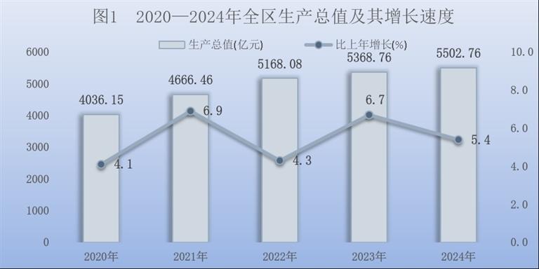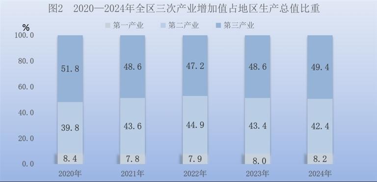 初步核算,全年全区实现生产总值[2]5502.76亿元,按不变价格计算,比上年增长5.4%。其中,第一产业增加值451.24亿元,增长6.2%;第二产业增加值2335.36亿元,增长7.0%;第三产业增加值2716.16亿元,增长3.9%。第一产业增加值占地区生产总值比重为8.2%,第二产业增加值比重为42.4%,第三产业增加值比重为49.4%。按常住人口计算,人均地区生产总值75484元,比上年增长5.3%。
