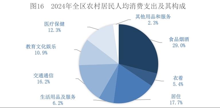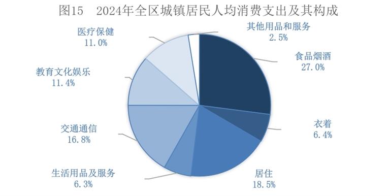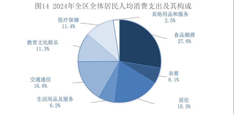 全年全区居民人均消费支出22865元,比上年增长5.7%。其中,人均服务性消费支出[18]9746元,增长7.3%,占居民人均消费支出的比重为42.6%。按常住地分,城镇居民人均消费支出28469元,增长5.1%;农村居民人均消费支出15622元,增长6.6%。全区居民恩格尔系数为27.6%,其中,城镇为27.0%,农村为29.0%。