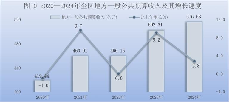 全年全区一般公共预算总收入868.43亿元,比上年增长2.0%。其中,地方一般公共预算收入516.53亿元,增长2.8%。在地方一般公共预算收入中,税收收入358.88亿元,增长1.6%,占地方一般公共预算收入的69.5%。