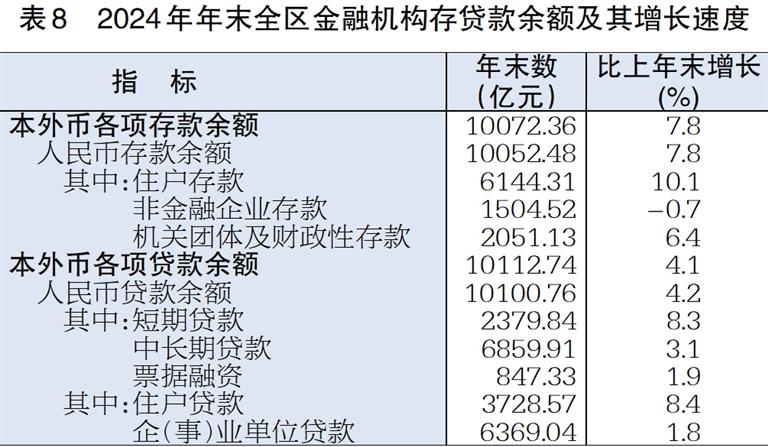 表8 2024年年末全区金融机构存贷款余额及其增长速度