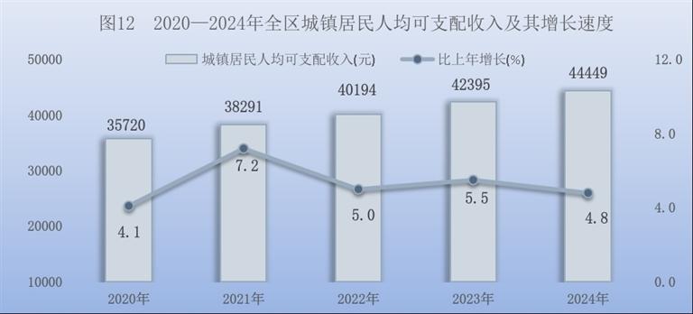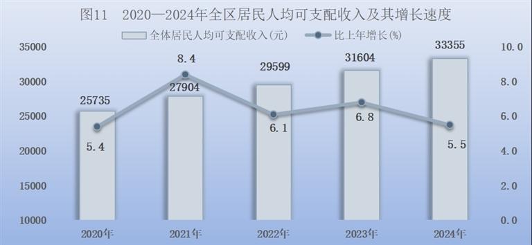全年全区居民人均可支配收入33355元,比上年增长5.5%。按常住地分,城镇居民人均可支配收入44449元,增长4.8%;农村居民人均可支配收入19015元,增长7.0%。
