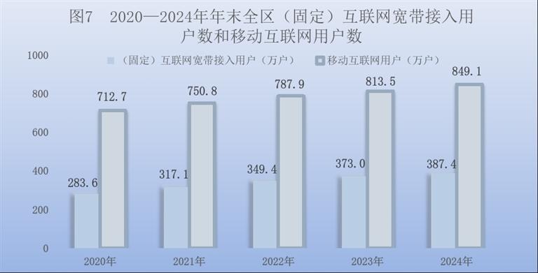 全年全区邮政行业寄递业务量累计完成2.7亿件,比上年增长21.3%。邮政业完成邮政函件业务239.5万件,包裹业务10.7万件,快递业务量1.8亿件,快递业务收入23.3亿元。全年完成电信业务总量[10]119.5亿元,比上年增长14.2%。年末移动电话基站数[11]6.5万个,其中4G基站4.1万个,5G基站2.0万个。(固定)互联网宽带接入用户387.4万户,比上年增加14.4万户。移动互联网用户849.1万户,比上年增加35.6万户;移动互联网用户接入流量25.2亿GB,比上年增长20.5%。