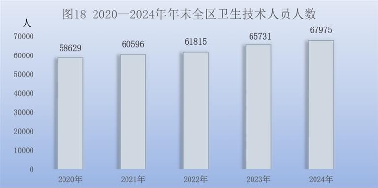 年末[20]全区共有医疗卫生机构4986个,其中医院219个,在医院中有公立医院72个,民营医院147个;基层医疗卫生机构4660个,其中乡镇卫生院204个,社区卫生服务机构254个,门诊部(诊所等)2063个,村卫生室2139个;专业公共卫生机构84个,其它卫生机构23个。年末全区卫生技术人员67975人,其中执业(助理)医师25671人,注册护士30787人。医疗卫生机构实有床位44286张,其中医院37738张,乡镇卫生院3754张。全年总诊疗人次5678.15万人次,出院人次149.91万人次。