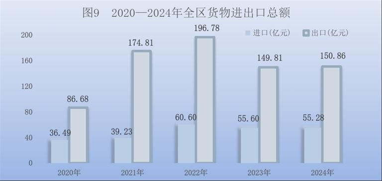 全年全区货物进出口总额206.13亿元,比上年增长0.3%。其中,出口150.86亿元,增长0.7%;进口55.28亿元,下降0.7%。对共建“一带一路”国家进出口总额93.84亿元,比上年增长0.4%,其中,出口73.93亿元,增长2.0%;进口19.91亿元,下降4.9%。