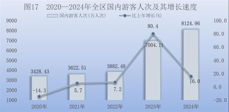 全年全区接待国内游客8124.96万人次,比上年增长16.0%。旅游花费766.45亿元,增长17.7%。