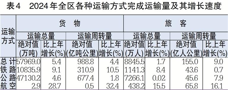 表4 2024年全区各种运输方式完成运输量及其增长速度