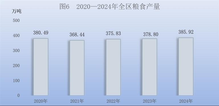 全年全区粮食总产量385.92万吨,比上年增加7.12万吨,增产1.9%。其中,夏粮产量24.70万吨,增产3.4%;秋粮产量361.22万吨,增产1.8%。全年稻谷产量19.21万吨,增产18.5%;小麦产量24.27万吨,增产3.5%;玉米产量299.32万吨,增产1.5%。马铃薯产量(折粮)29.31万吨,减产2.3%。